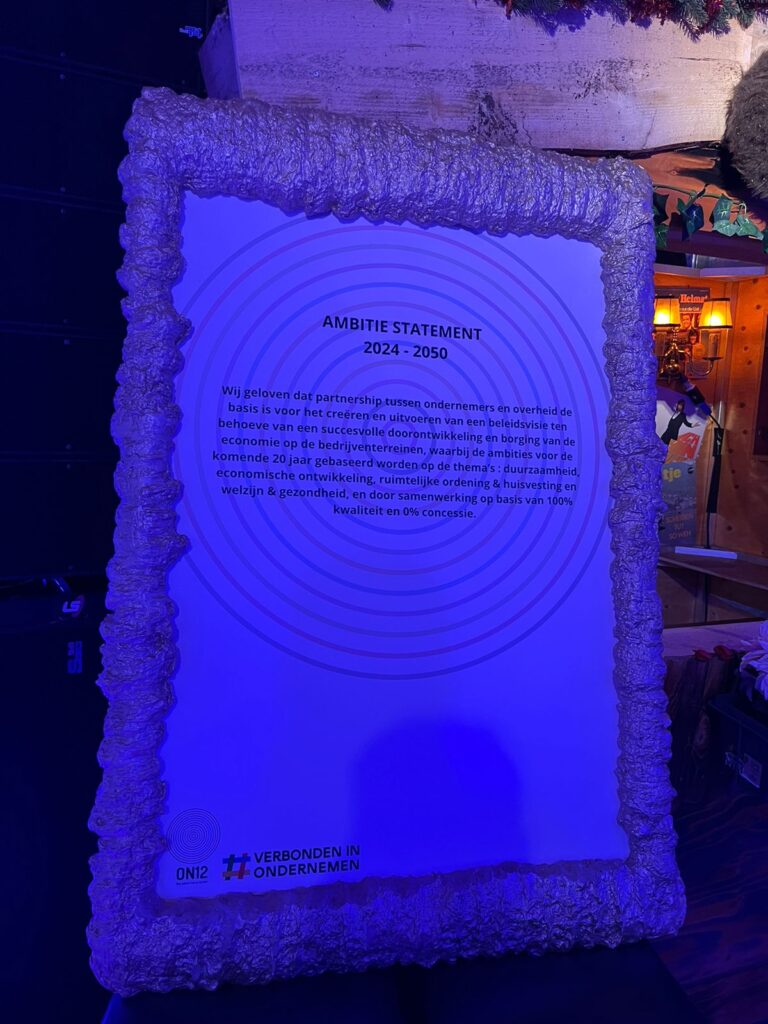 Onze voorzitter Igor Soons stelt jullie voor aan het nieuwe team dat aan de slag gaat op onze bedrijven terreinen en samen tekenen we ons ambitestatement 2024-2050. De mooie woorden van de burgemeester daar bovenop. Dan mogen we oprecht spreken over een zeer geslaagde bijeenkomst. En voor degene die zijn meegeweest naar de after party; uniek, super gezellig en hoe mooi dat we met pakweg 35 man ongepland nog een paar uurtjes de kroeg in zijn gedoken!